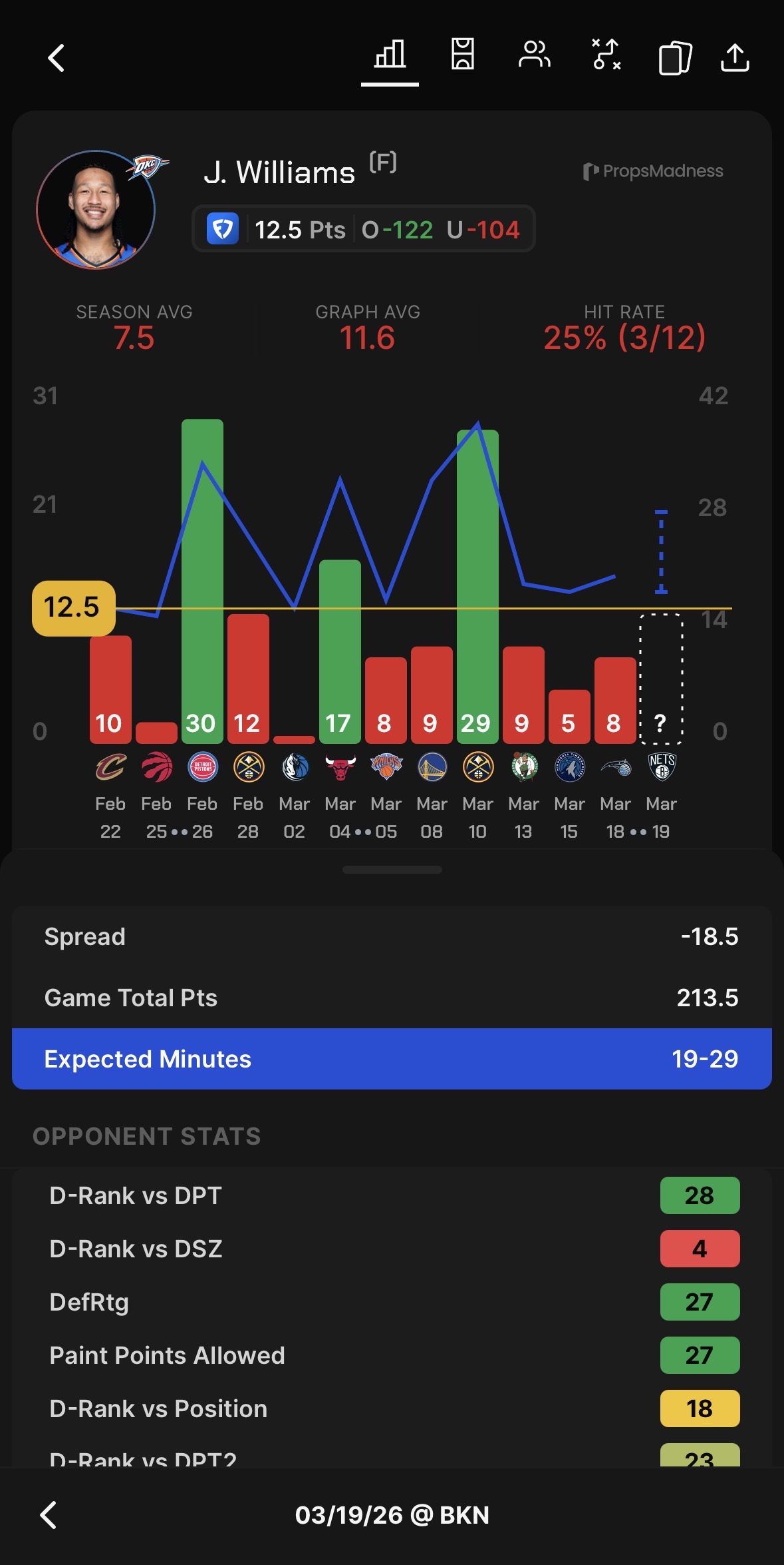 This is exactly the research problem PropsMadness was built to solve. It shows expected minutes projections for every player alongside their performance graph, so you can filter out games where a player's role was significantly different from what is projected tonight. That context alone changes how you read a line.